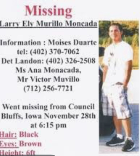 Larey Ely Murillo-Moncada fue visto por última vez el 28 de noviembre del 2009en Council Bluffs cuando se encontraba trabajando.