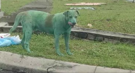 Pintado, llorando y buscando comida fue encontrado un perro por un joven residente de Petaling Jaya en Malasia.ñ provocando molestia entre los cibernautas.