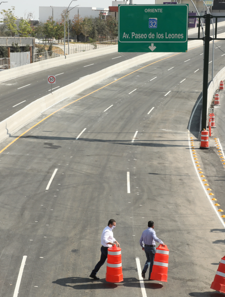 El alcalde Adrián de la Garza Santos, encabezó el retiro de los trafitambos que impedían el paso por la parte alta del puente en el sentido de Poniente a Oriente, al tiempo que en el sentido contrario también se abría la vialidad.