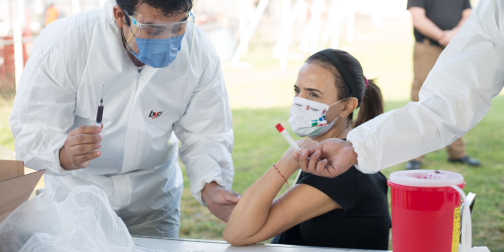La mañana de este martes, la Alcaldesa Clara Luz Flores acudió al módulo instalado en el Parque Lineal Las Torres, donde le tomaron muestra de sangre para el estudio “Prevalencia de Anticuerpos contra SARS-CoV-2”.