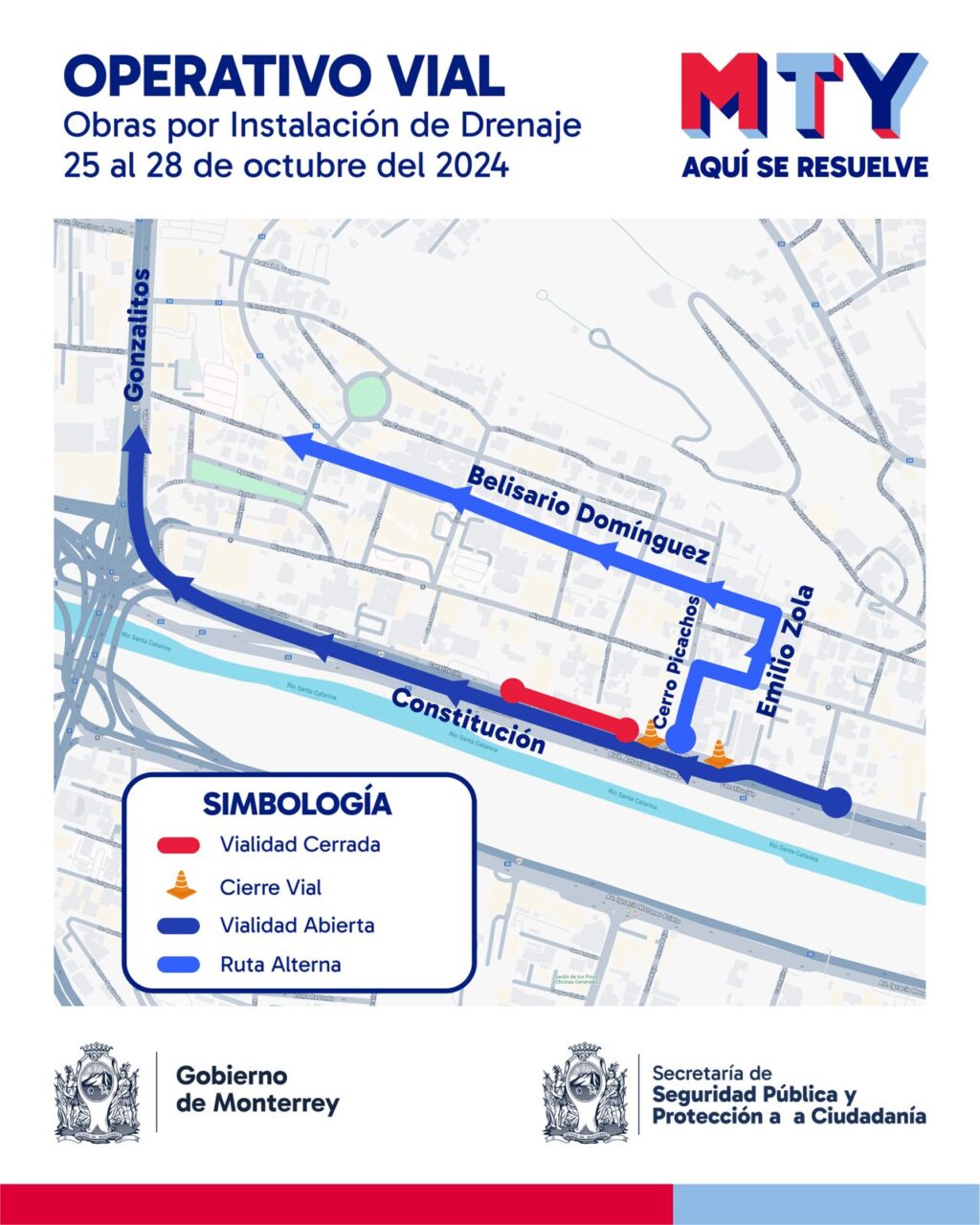 La Dirección de Vialidad y Tránsito de Monterrey informa que las restricciones inician este viernes 25 de octubre a las 23:00 horas y la apertura se contempla para el martes 29.