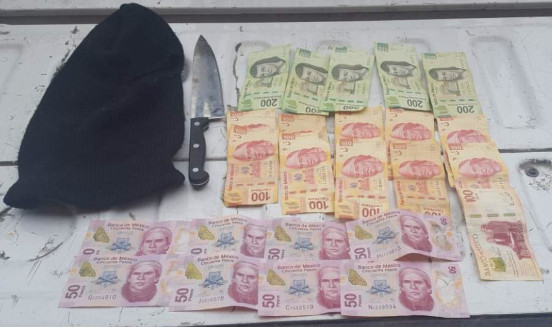 Héctor mostró nerviosismo ante los uniformados, por lo que fue sometido a una revisión corporal, hallándole los dos mil 500 pesos, un cuchillo y un pasamontañas que presuntamente habría utilizado en el robo; además de tener un tatuaje en la mano izquierda similar al descrito por la cajera del negocio.