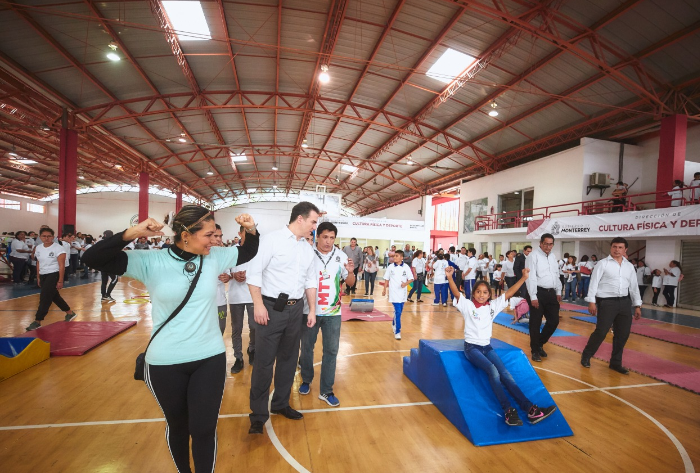 El Alcalde Adrián de la Garza Santos, acudió al Gimnasio Monterrey 400, para supervisar el proyecto, donde los participantes realizaron una serie de ejercicios de motricidad diseñados de manera incluyente.