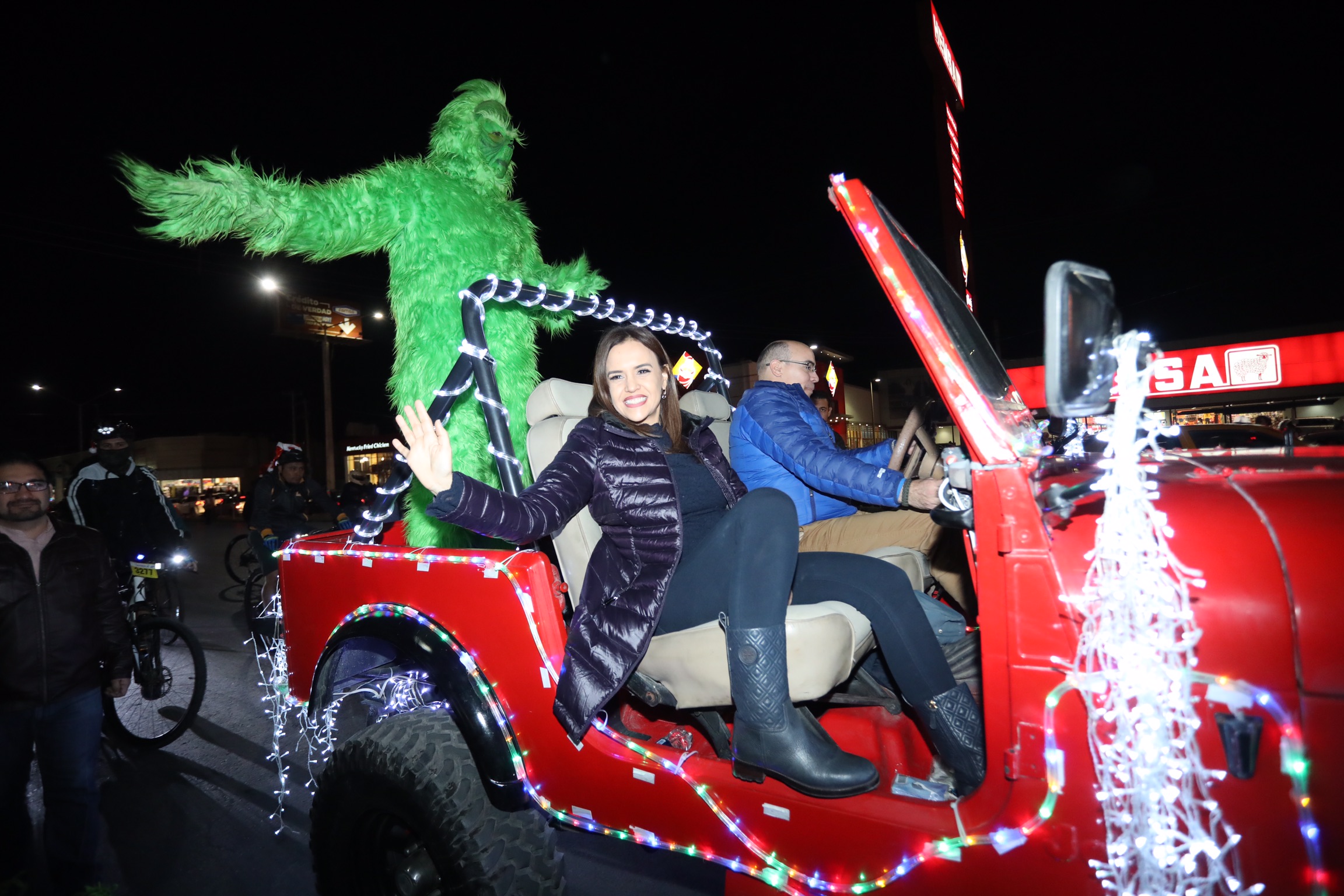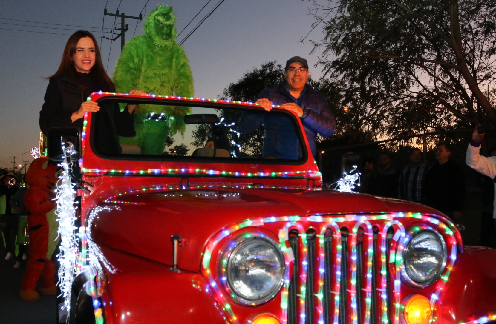 A bordo de un jeep rojo adornado con luces navideñas, la Alcaldesa Clara Luz Flores Carrales, y el Alcalde Zeferino Salgado Almaguer encabezaron el Tradicional Desfile que inició en la Colonia Balcones de Anáhuac, y recorrió diferentes sectores de Escobedo.