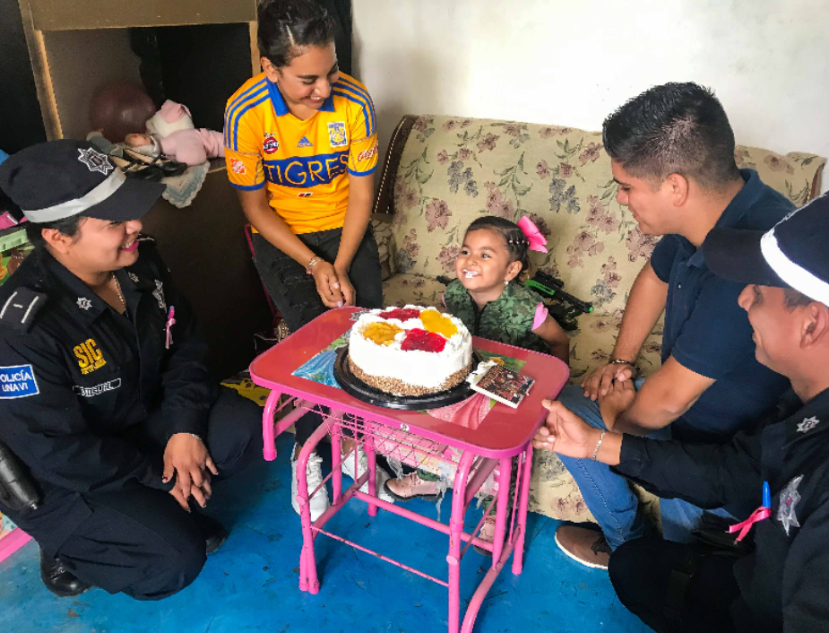 Con pastel, regalos y cantándole las tradicionales Mañanitas, elementos de la Secretaría de Seguridad Ciudadana y Justicia Cívica del Municipio de Escobedo cumplieron el sueño de una pequeña de 4 años: festejar su cumpleaños con elementos policiacos.