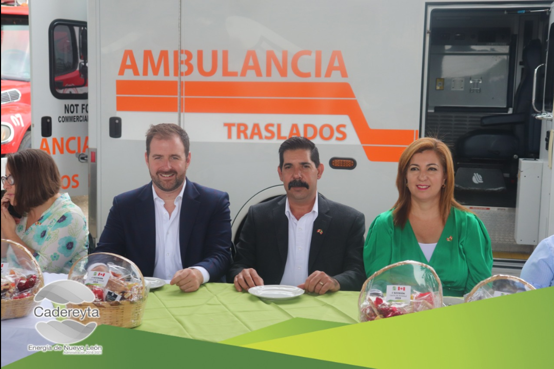 Para hacer entrega formal de una ambulancia y equipo para elementos de bomberos y firmar un convenio de colaboración mutua, el cónsul de Canadá, Frederick Caldwell visito el Municipio de Cadereyta y al Presidente Municipal, Ernesto Quintanilla, en las instalaciones de Servicios de Emergencias.