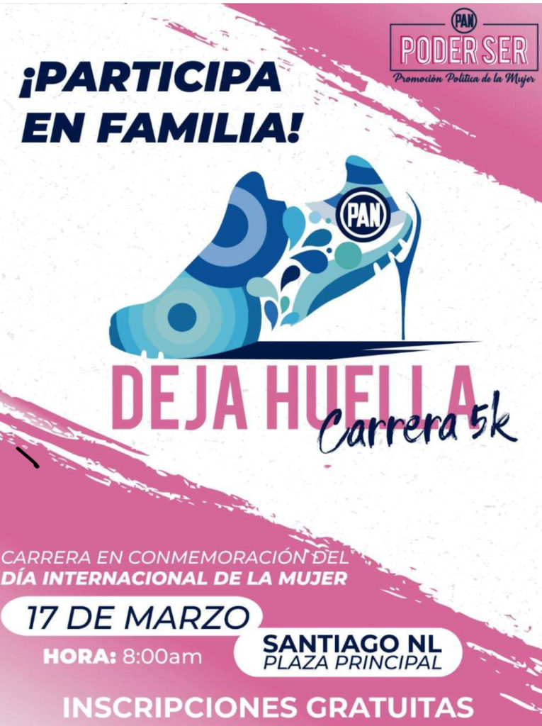 Promueve la Secretario de Promoción Política del PAN carrera en Santiago Nuevo León, el maratón de 5 K es conmemorativo al Día Internacional de la mujer este próximo 17 de marzo a partir de las 8:00 horas.