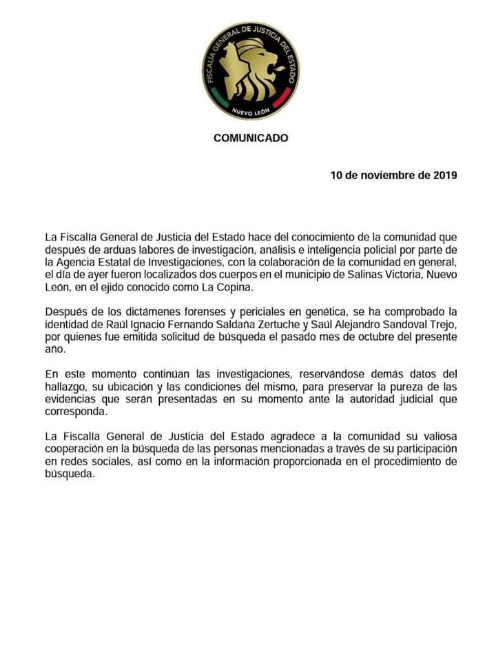 Confirma la Fiscalía General de Justicia en Nuevo León que los cuerpos localizados en Salinas Victoria dieron positivos en las pruebas periciales realizadas confirmaron la identidad de los dos estudiantes desaparecidos el 17 de octubre.