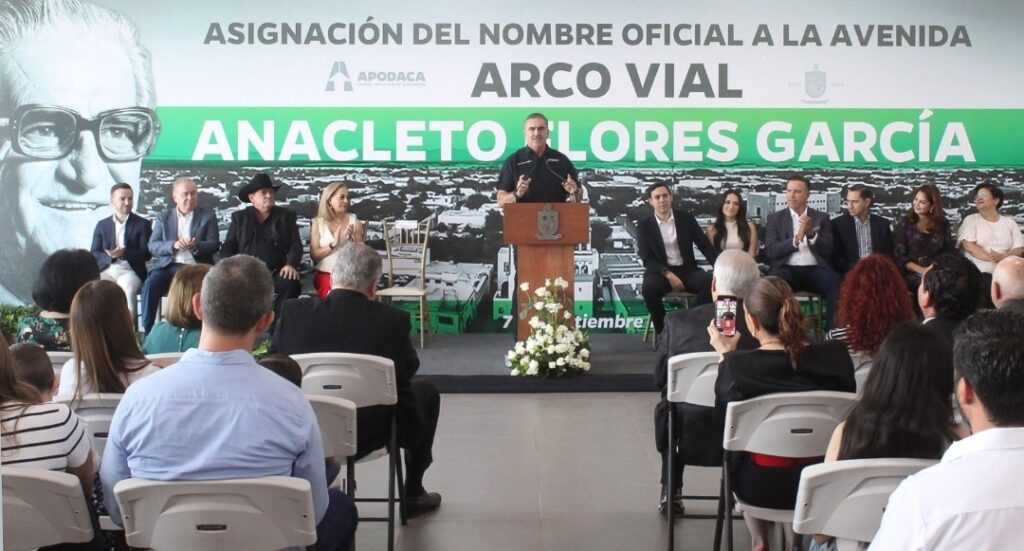 En una ceremonia encabezada por el Alcalde de Apodaca, César Garza Villarreal, el Acalde Electo, César Garza Arredondo, así como Raymundo y Óscar Flores Elizondo, se llevó a cabo la Develación de la nomenclatura del nuevo nombre que llevará la avenida.