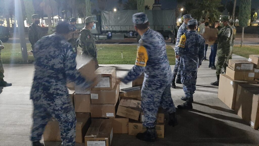 Apodaca, Nuevo León, a 14 de noviembre de 2020. La Secretaría de la Defensa Nacional a través de las Comandancias de la IV Región Militar y 7/a. Zona Militar, informan a la opinión pública, que el día de hoy, se llevó a cabo la recepción de 4 (cuatro) toneladas de insumos médicos, material y equipo de protección, para los 4 hospitales COVID-19, que están atendiendo pacientes sospechosos y positivos por el virus SARS-CoV-2,