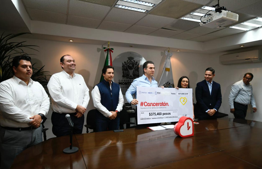El alcalde de Monterrey, Adrián de la Garza Santos, recibió de manos de Águeda Anzúa Torres, del Patronato del Instituto Nacional de Cancerología (INCAN), un donativo por poco más de 375 mil pesos.