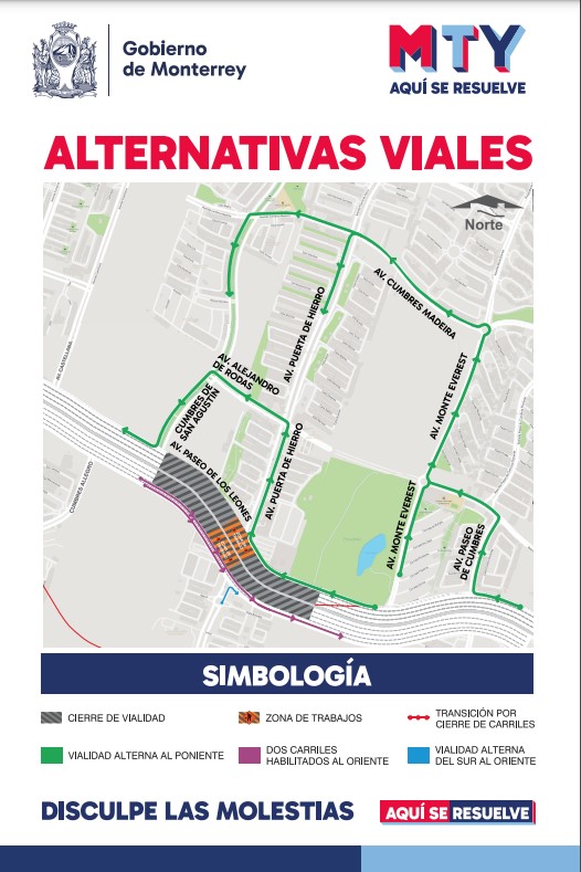 No obstante, se contará con la opción de transitar por la calle Paseo de Cumbres e incorporarse a Monte Everest, posteriormente tomar Cumbres Madeira hasta Cumbres San Agustín para ingresar a Paseo de los Leones.
