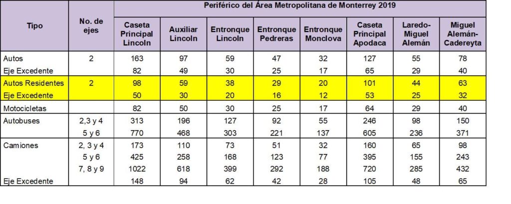 En el Periférico para quienes pasen por la caseta Apodaca: De 121 pesos a 127 pesos.