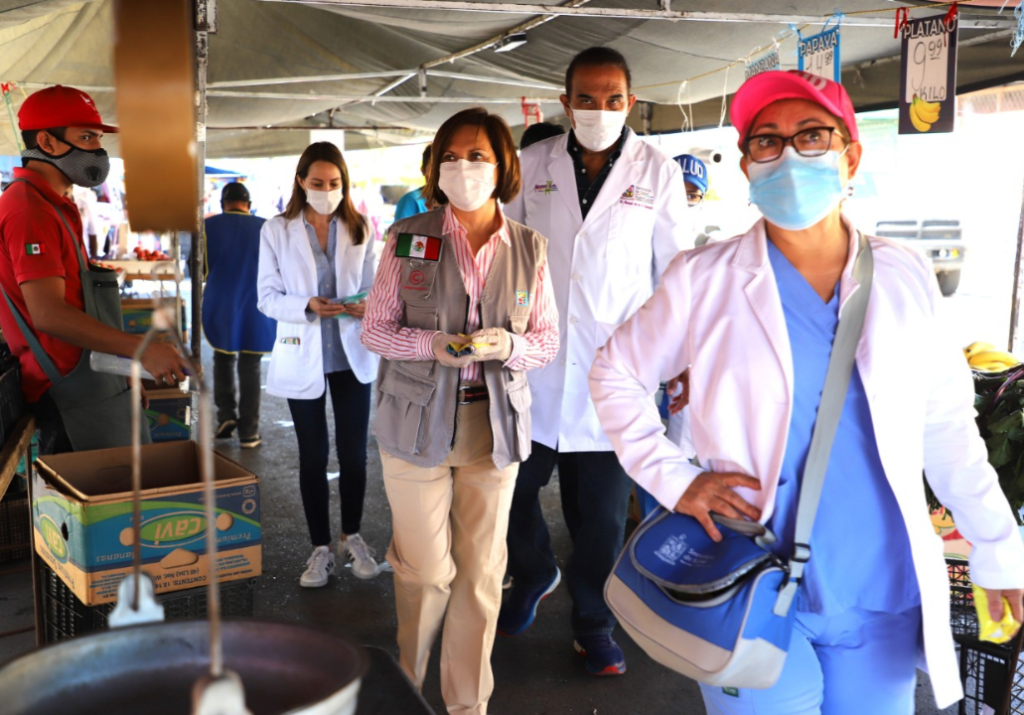 Para constatar que se cumplan las medidas sanitarias, la Alcaldesa de Guadalupe, Cristina Díaz, acompañó al Secretario de Salud Estatal, Manuel de la O Cavazos, en un recorrido por el mercado rodante instalado en la colonia Nuevo San Rafael.