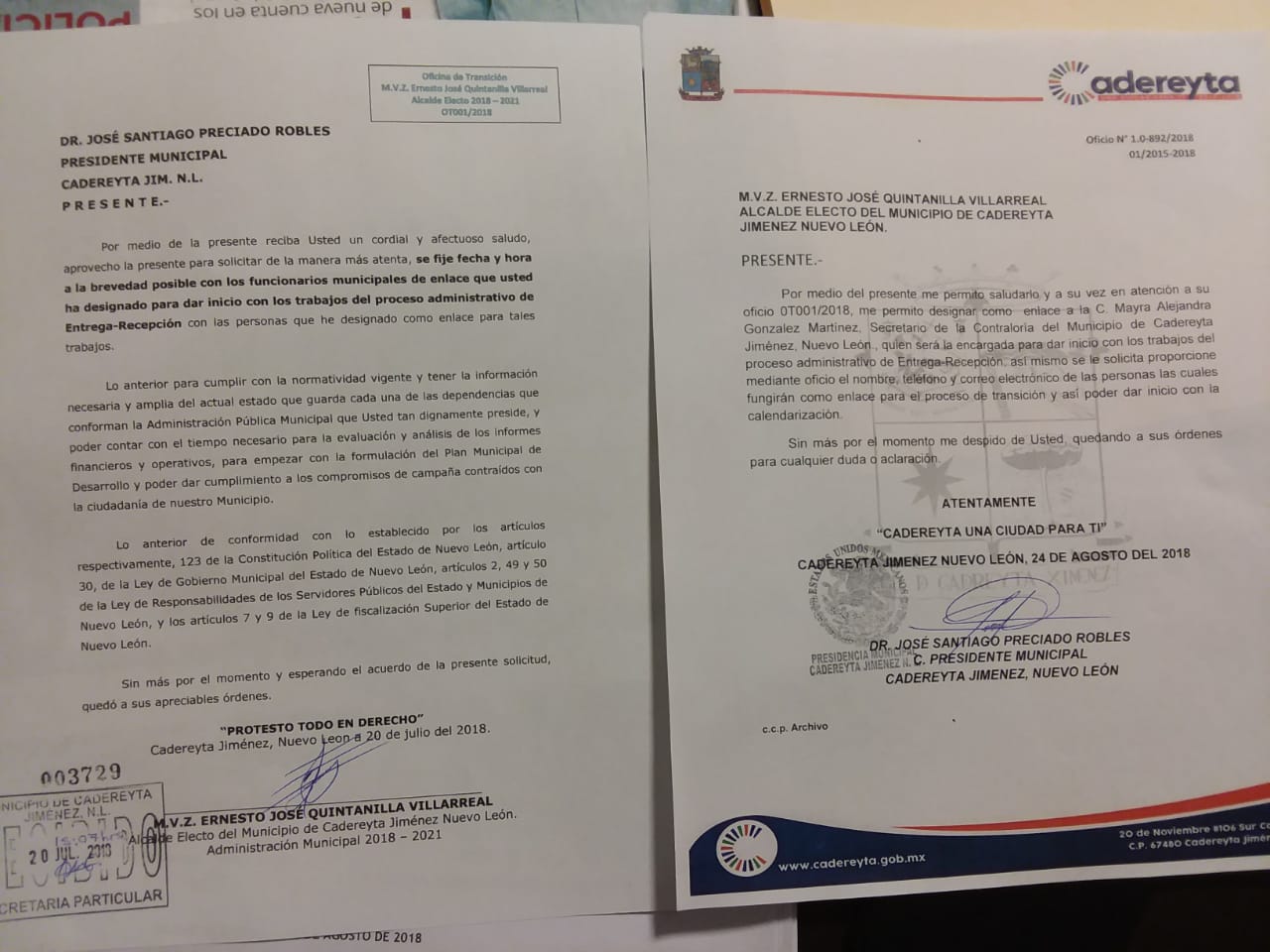Después de un mes el alcalde en funciones José Santiago Preciado contestó la petición del edil electo Ernesto Quintanilla para iniciar los trabajos de transición y designo a Mayra Alejandra González Martínez de la Contraloría Municipal para iniciar la agenda de los trabajos.