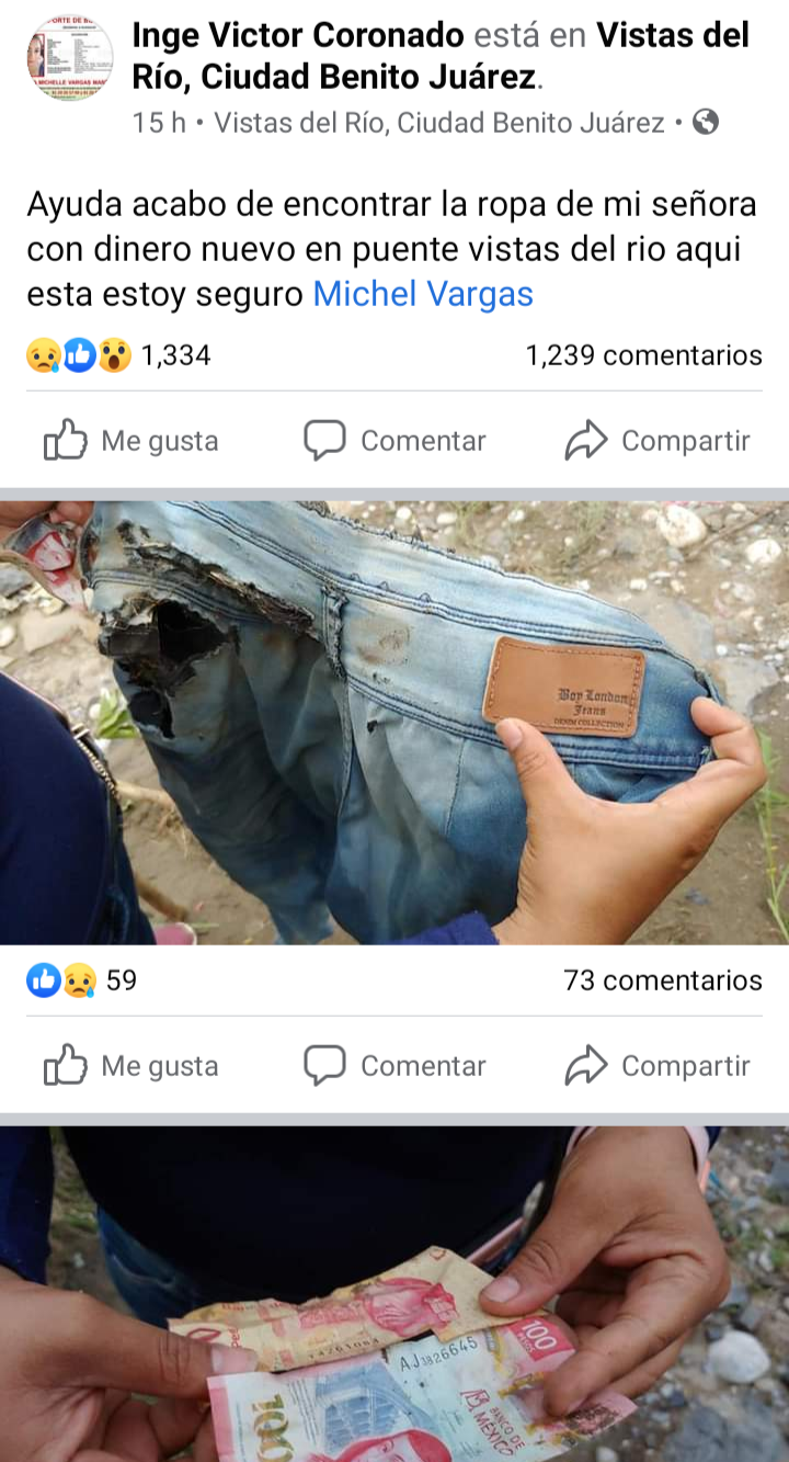 En la cuenta de Facebook a nombre de Inge Víctor Coronado nuestras el pantalón y dos billetes de cien pesos, aseguramos que le pertenecieron a Tania.