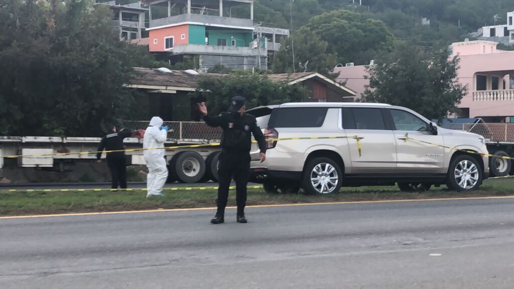 La camioneta de reciente modelo quedó sobre el camellón central, en el ñ kilómetro 247 de la Carretera Nacional, dónde los peritos y elementos de la Agencia Estatal de Investigaciones para recabar evidencias del hecho.- publicidad.