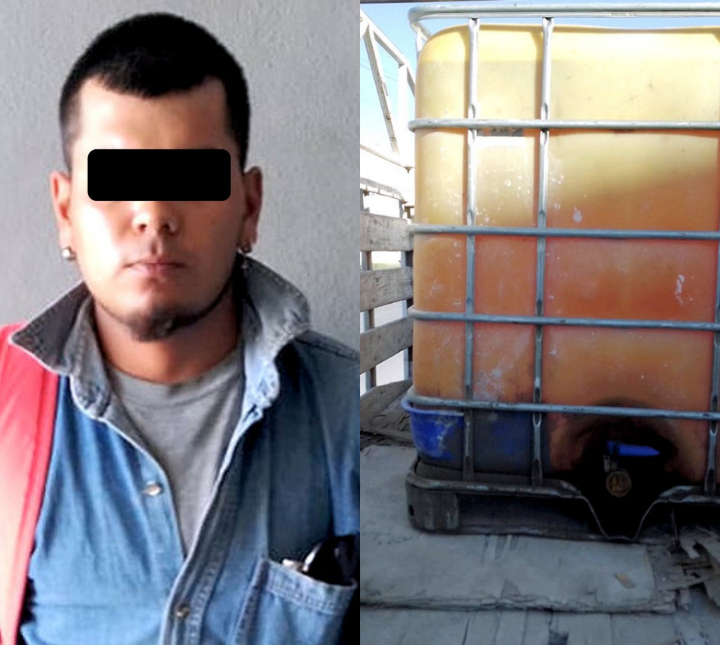 Policías de la Guardia de Proximidad detuvieron a un conductor de una camioneta que transportaba en un contendedor mil litros de gasolina diésel, que no pudo demostrar su comprar legal, porque lo que presuntamente la gasolina sería obtenida en actividades de huachicoleo o robo de hidrocarburo.