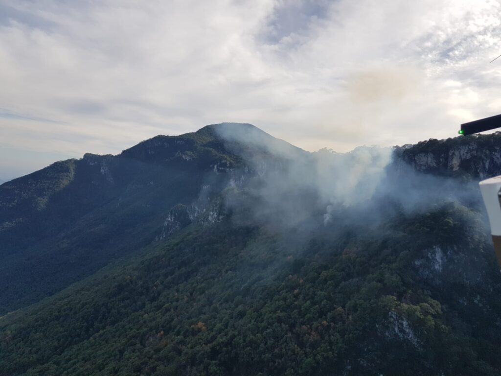 En los trabajos participan brigadistas de Protección Civil Nuevo León, PC Santiago y CONAFOR, quienes realizan el ataque terrestre.
